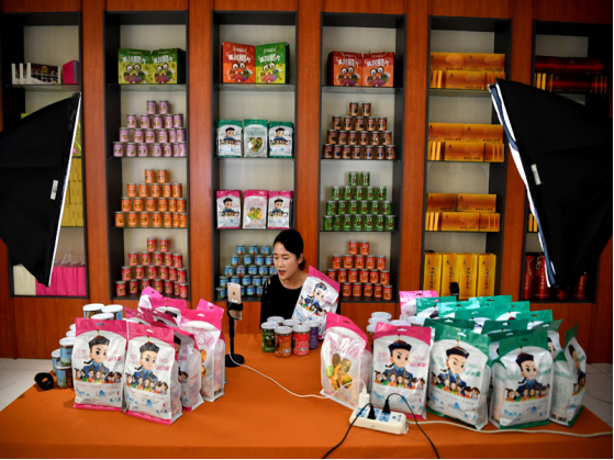 在陕西省商洛市丹凤县一家食品公司,主播在进行网络直播(7月20日摄)。新华社记者 刘潇 摄