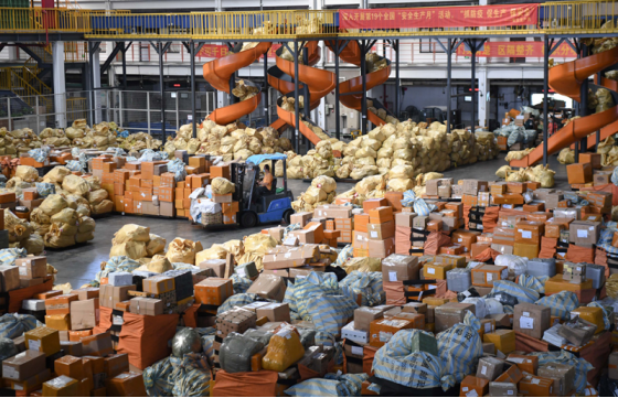 11月10日,在中国邮政集团广州航空邮件处理中心,工作人员在总包待发区内作业。新华社记者 邓华 摄